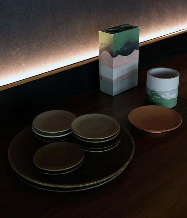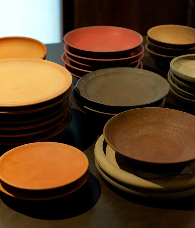 “As with the earth walls,” says Winteridge, “the crockery was based on locally sourced materials and was developed to frame dishes made from local ingredients.”
