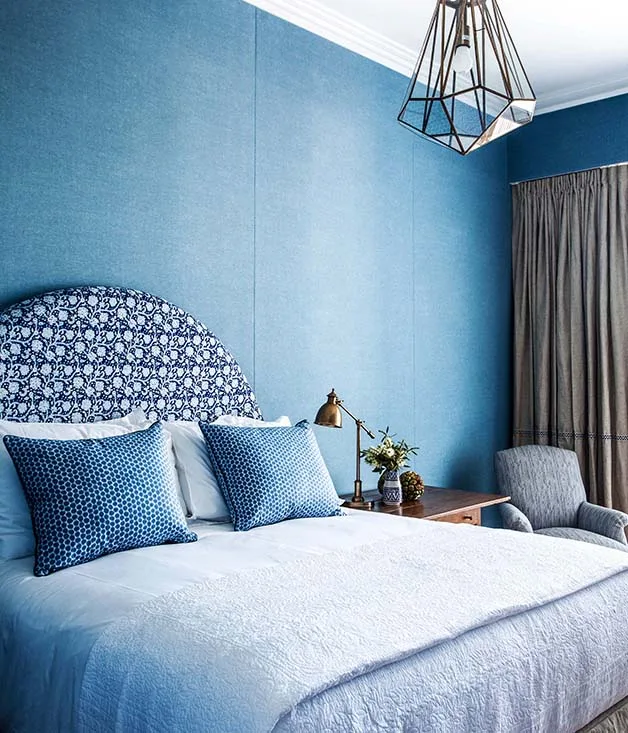 Textured wallpaper and layered blue linens give rooms a luxurious feel.
