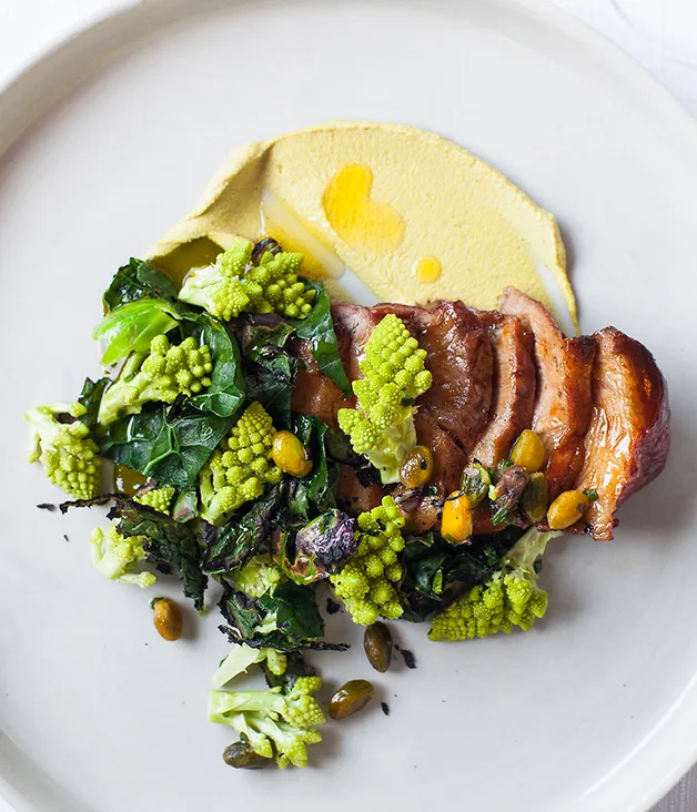 Served with romanesco, cavolo nero and pistachio.