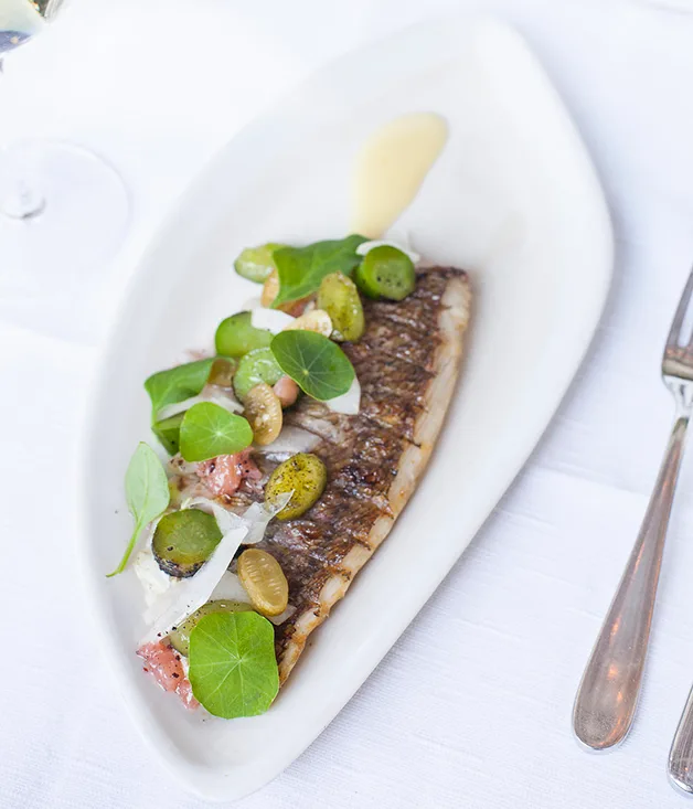 Coal-roasted fish with salted lemon and cucumbers