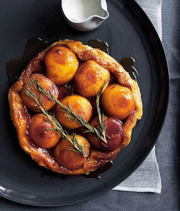 Peach and rosemary tarte Tatin with runny cream