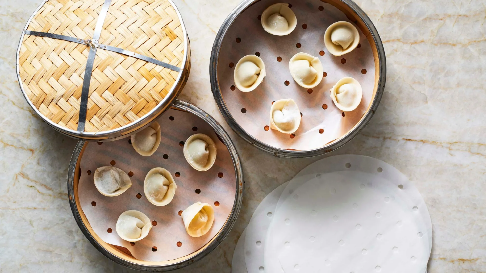 Steam dumplings in batches over a large saucepan of boiling water until skins are slightly translucent (3-4 minutes; alternatively, cook dumplings in boiling water until they rise to the surface).