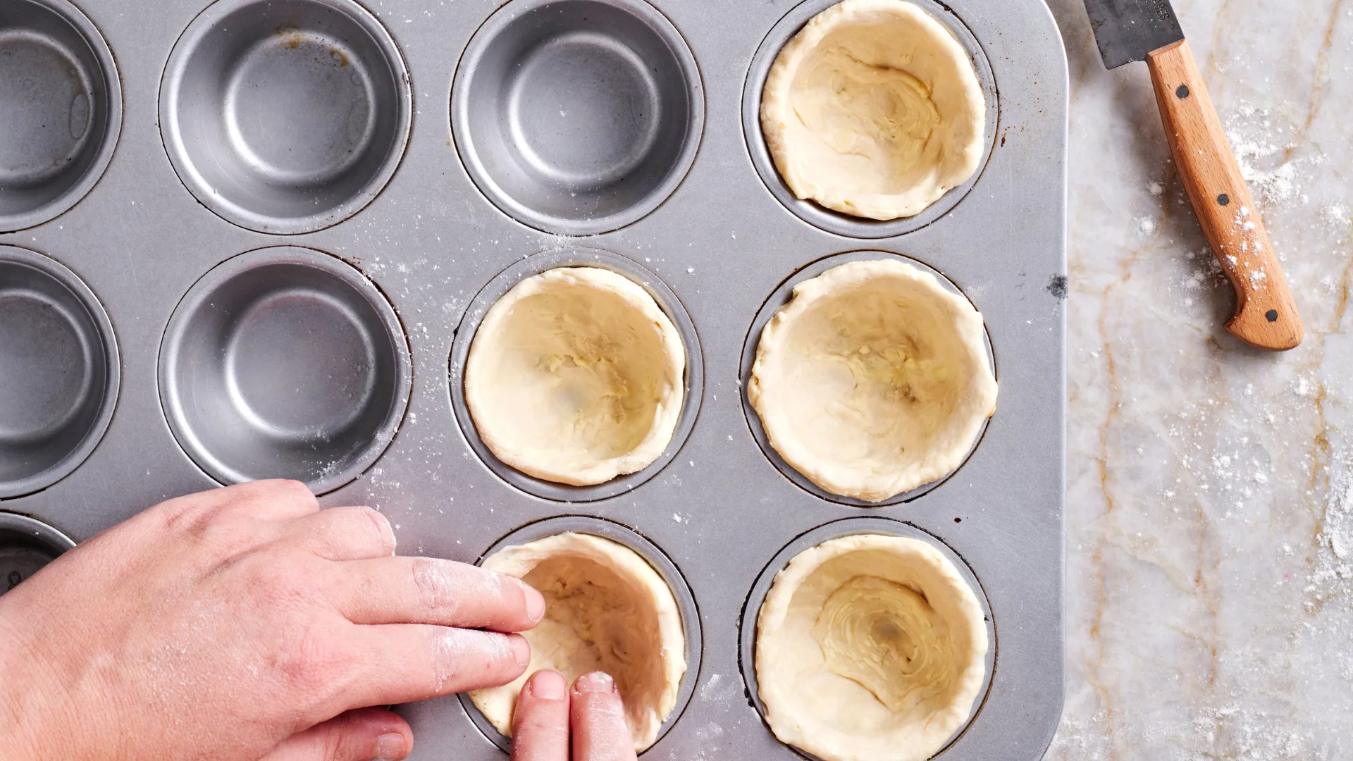 Slightly trim ends from pastry log, then cut into 12 equal discs. Place each pastry disc, cut-side up in a 12-hole 80ml (1/3 cup) muffin tin, press the centre of the spiral into the bottom of each cavity and ease pastry up the side and 3mm beyond hole rim. Freeze for at least 30 minutes or until required.