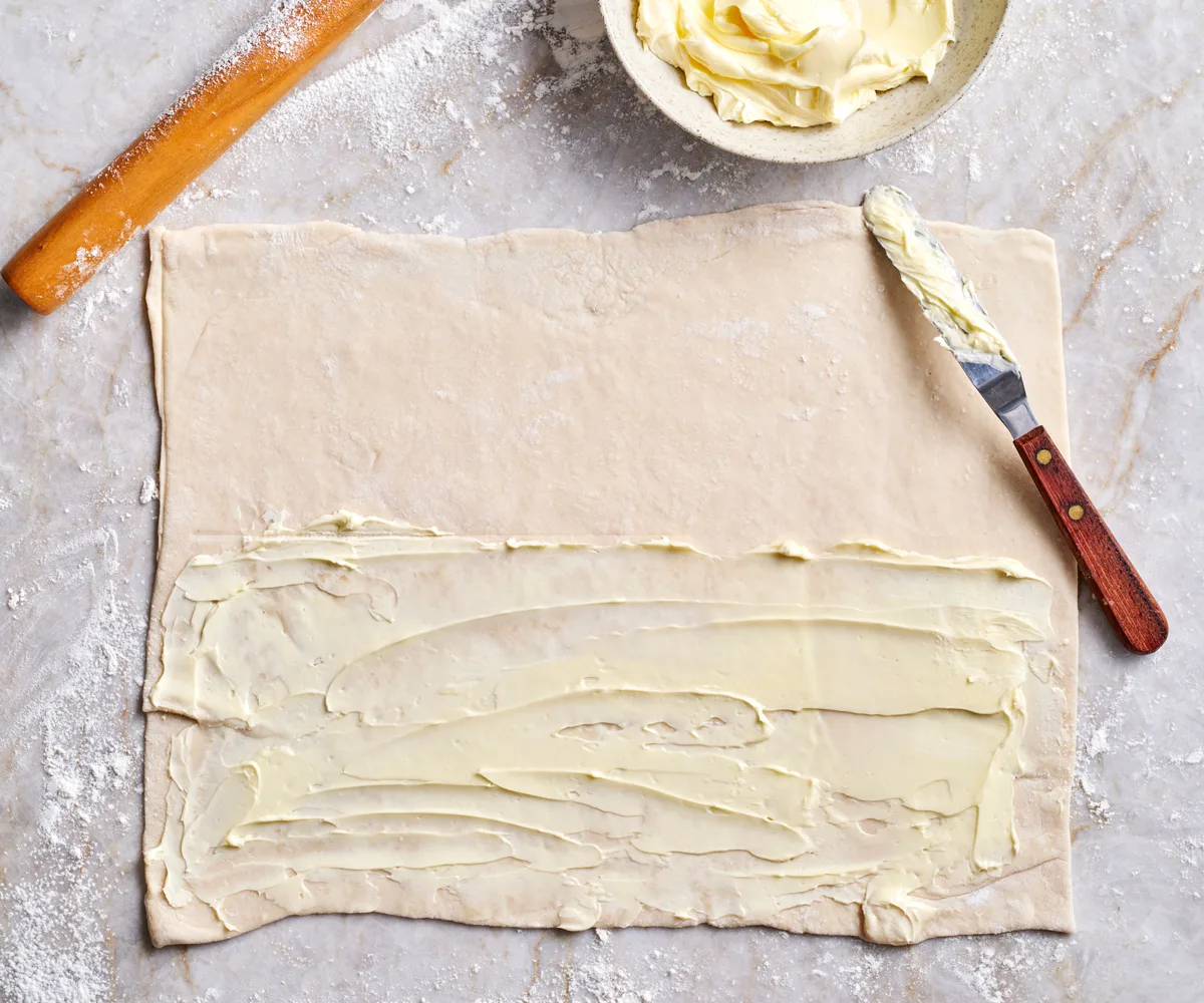 Continue rolling out pastry rectangle to form a 35cm square. (Lift it occasionally to prevent it sticking. Using an offset palette knife, spread 60g soft butter over bottom half of dough, leaving a 1cm border. Fold unbuttered side of dough over the buttered side, press edges to seal. Repeat process, rolling dough to a 35cm square, spreading with another 60gm butter and folding, then rotate dough 90 degrees. Roll dough out to a 35cm square. Starting at the edge closest to you, work your fingers along the edge, rolling the dough up tightly into an even log shape. Enclose in plastic wrap and refrigerate to firm (4 hours or overnight).