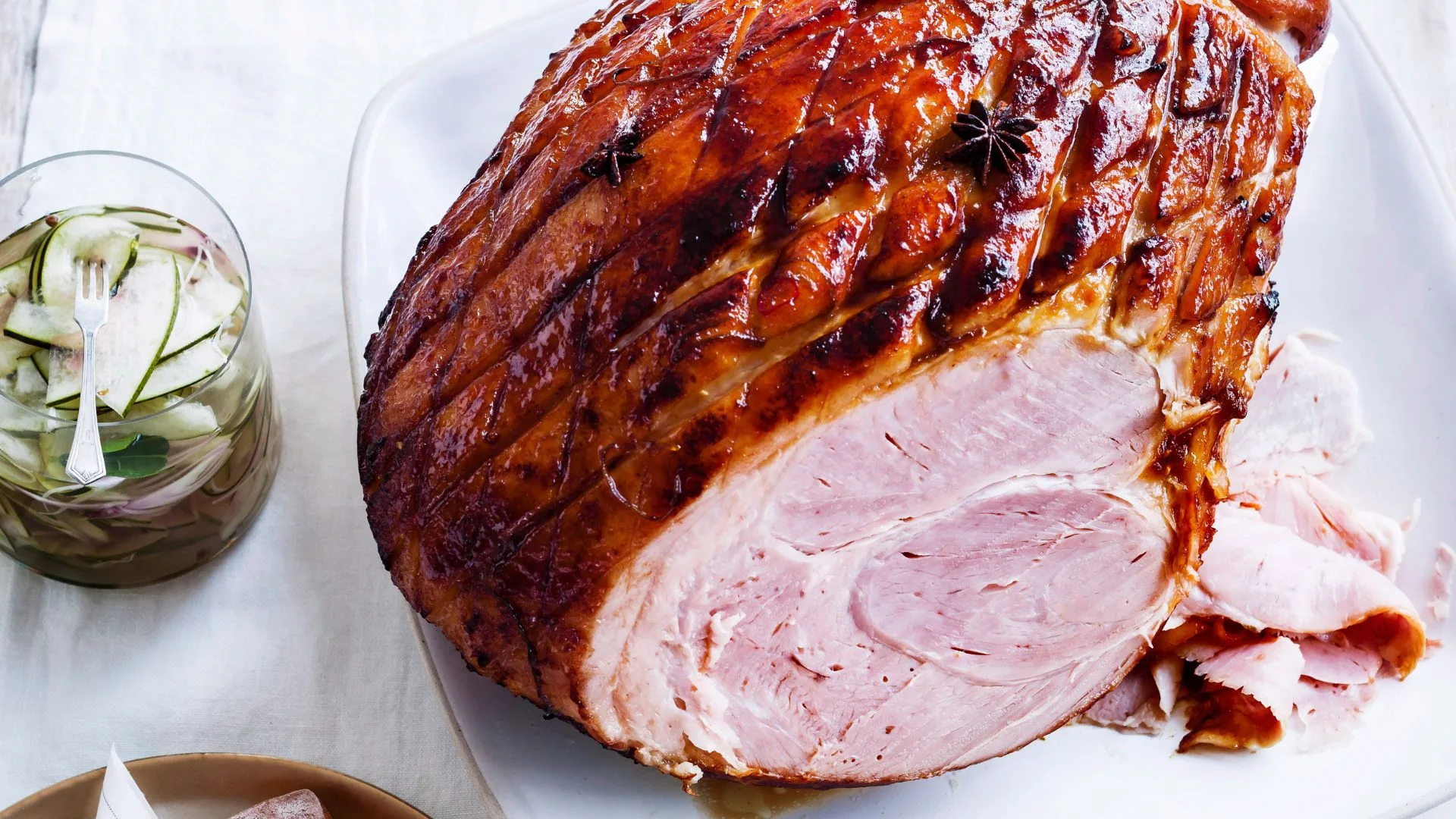 Place ham in a large roasting pan with a cup of water, then brush with glaze at regular intervals for about 30 minutes while baking. Bake until sticky, golden and warmed through (1½-2 hours). Rest for 30 minutes before carving.