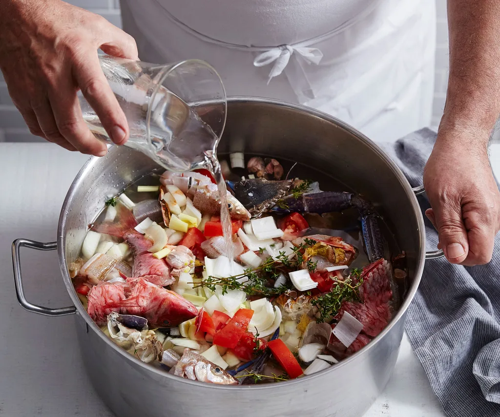 We’d go to the market to find seven varieties of fish and two or three types of shellfish. If we were in luck, we’d find tiny red spot whiting and red mullet, the latter being critical, like rock cod. Blue swimmer crabs, prawns and lobster were added for depth of flavour, while leatherjackets and flathead provided the middle palate, snapper, John Dory, whiting and blue-eye trevally extra complexity and, when available, eel made a nod to the original bouillabaisse.