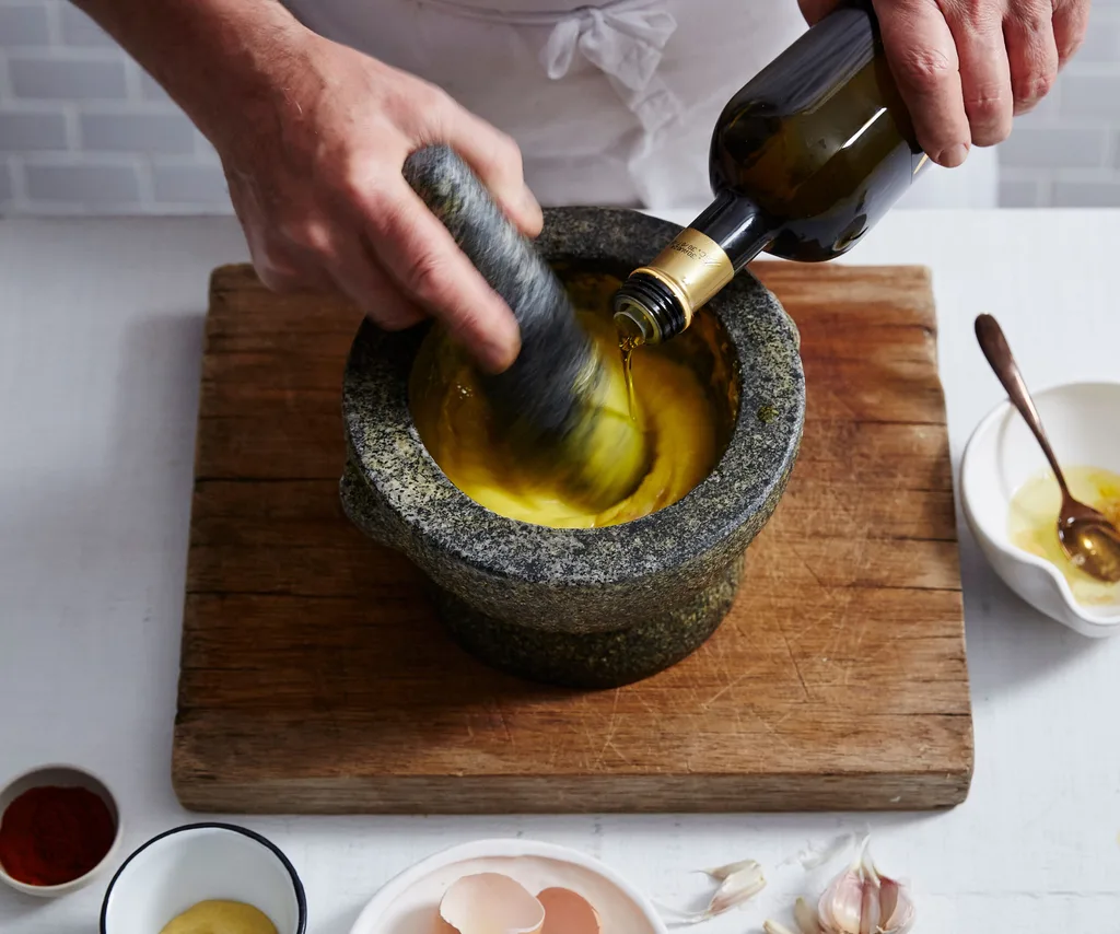 A magnificent traditional sauce, la rouille (“rust” for the colour extracted from the chillies), was made by reducing some of the soup to an essence, adding dry bread and pounding it with chillies, garlic, saffron, and a touch of mustard before adding egg yolks and making a mayonnaise with extra-virgin olive oil.