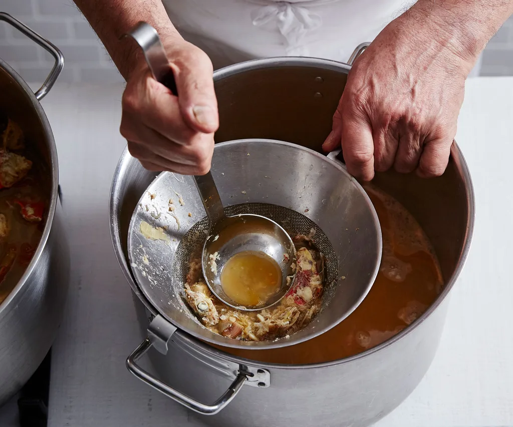 The key to the authentic flavour was in the smashing and pounding of the ingredients through a cone-shaped sieve, or chinois, using a conical wooden pestle. The soup was cooked for an hour and never skimmed, then left for another hour to settle and mature before the step that brings the flavour: the reduction.