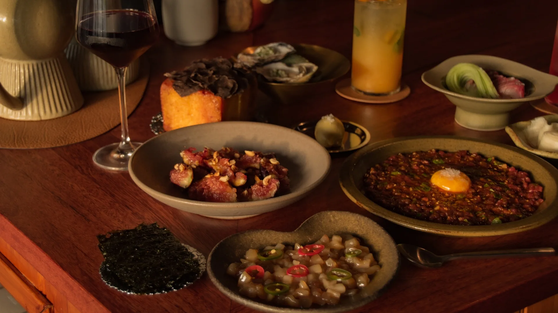 At night, Claydon and Jeoung delve deeper into Korean cuisine with a clever menu devoted to anju (dishes designed to pair with drinks). Soy-marinated raw prawn and scallop pays homage to ganjang-gejang (marinated raw crab), delivering bold umami and spice – no claw-cracking required. A take on ssam sees yukhoe (beef tartare) mixed with sweet-spicy gochujang and topped with a raw egg yolk. It’s served with lettuce, pickled daikon, white kimchi and gim (seaweed sheets) for wrapping.