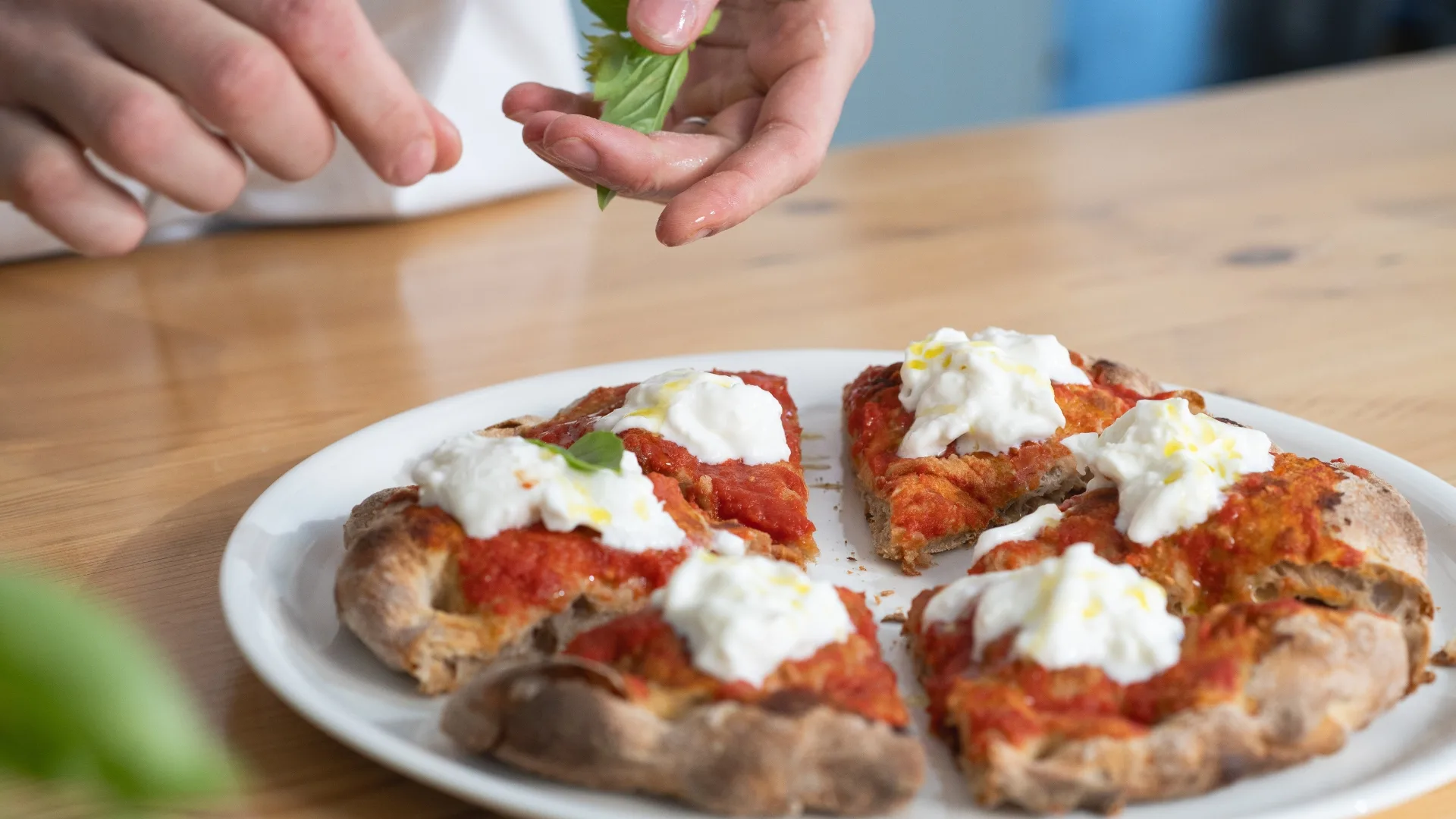 Sgarbossa’s Japanese wife Akiha works the room like a ray of sunshine, explaining the pizza base landscape to come. There’s classic (light and fluffy), thin and crispy (Roman-style) made with sustainably farmed Italian grain, and her husband’s signature double-cooked dough; a 24-hour multigrain sourdough base, par-baked and finished in the oven. The result is airy and cloud-like with ciabatta-style crunch. The wizardry is topped with burrata, folds of prosciutto di Parma, and tomato dust.